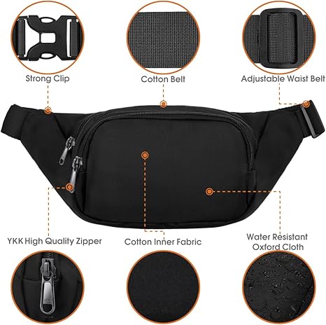 This black bumbags fanny packs for women men is made of high-quality waterproof Oxford material which can keep your items in the bag dry in almost weather conditions, but please don't soak this bum bag waist pack into the water.